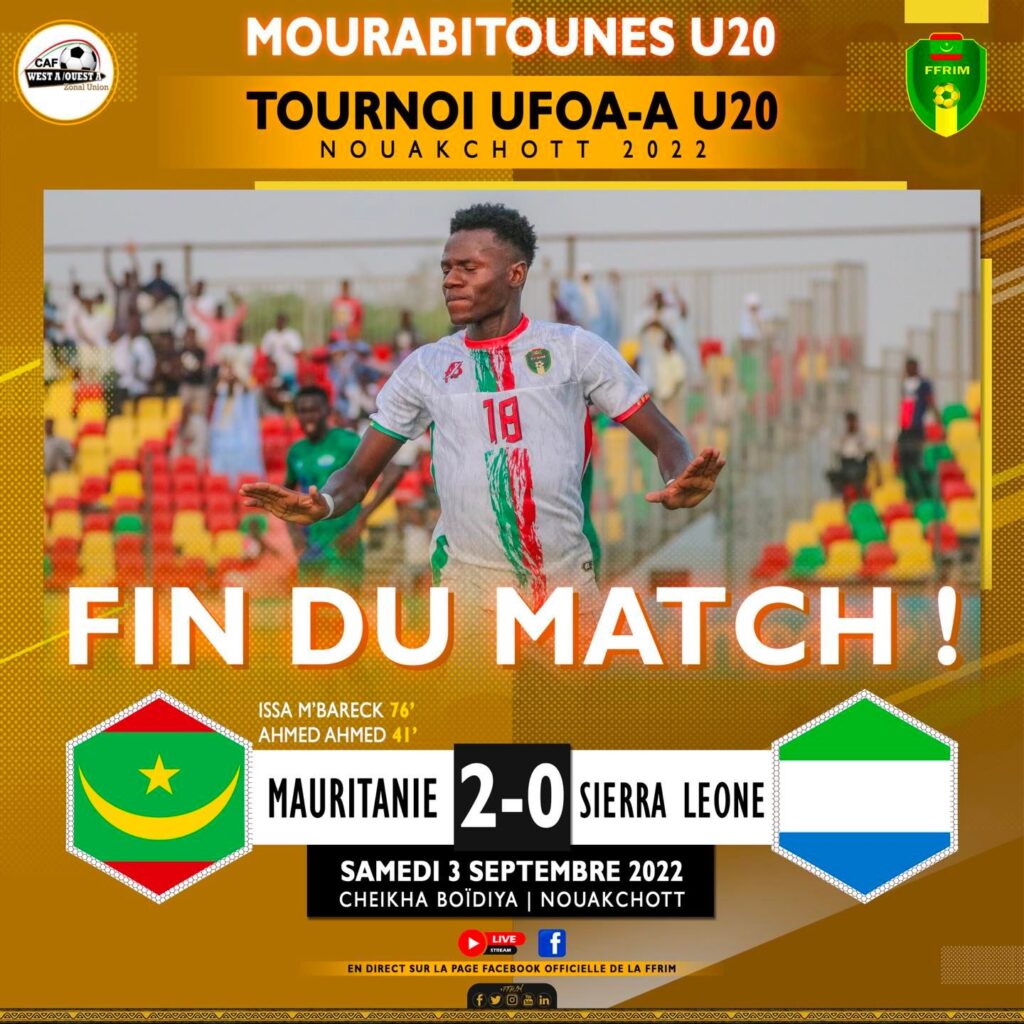 Nouakchott, 3 sept 2022 (AMI) – L’équipe nationale de football des moins de 20 ans a disposé de la Sierra Leone, 2 buts à 0. La Mauritanie avec ses 6 points est première de la poule A, en attendant le résultat de Guinée-Bissau vs Mali. Les mourabitounes vont se qualifier en demi-finale du tournoi UFOA U20, si la Guinée Bissau ne remporte pas son face à face contre le Mali.
