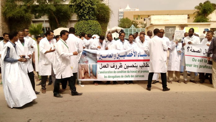 LeReflet – Les médecins mauritaniens ont tenu un sit-in devant le ministère de la santé, lundi 17 juillet 2017. La manifestation est organisée par le syndicat des médecins spécialistes en collaboration avec celui des médecins généralistes. Les porteurs des blouses blanches protestent contre leurs conditions de vie et de travail.